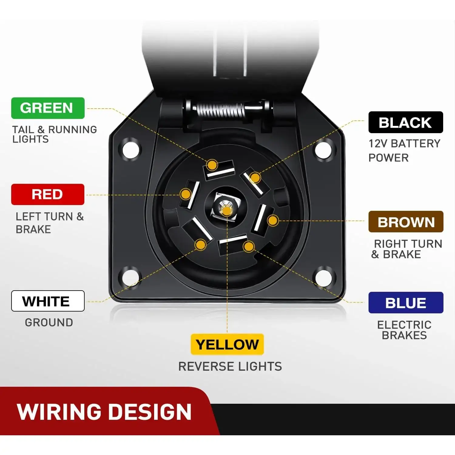 ·Durable construction: For long-lasting use and a reliable connection, the housing of the 7-pin truck wiring socket is made from durable molded black plastic and has a spring-loaded dust cover to protect the connection points.
