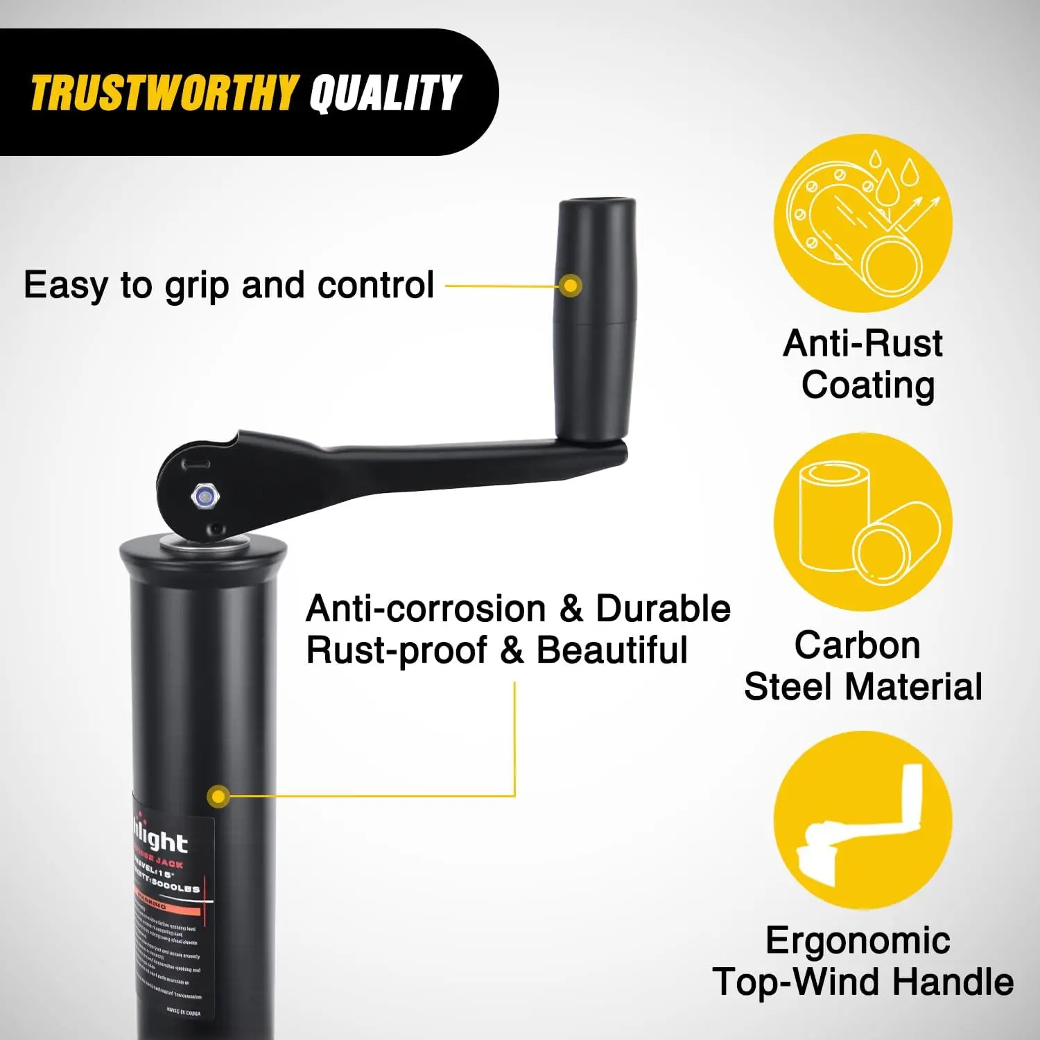 ·DURABLE MATERIAL: The heavy duty trailer jacks main body adopts high-strength alloy steel forming process, which can bear long-term load without deformation. The surface is specially coating with black powder to prevent rust, corrosion, and UV aging. It can be used for a long time in humid, dusty, and sandy environments