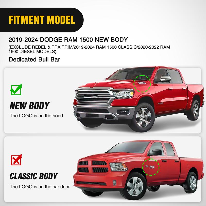 ·Fits: Compatible with 2019 2020 2021 2022 2023 2024 Dodge Ram 1500 New Body (Does not fit Rebel&TRX/2019-2024 Ram Classic/2020-2022 Ram Diesel models) NOTE: Anti-collision bars may interfere with ACC (Adaptive Cruise Control)