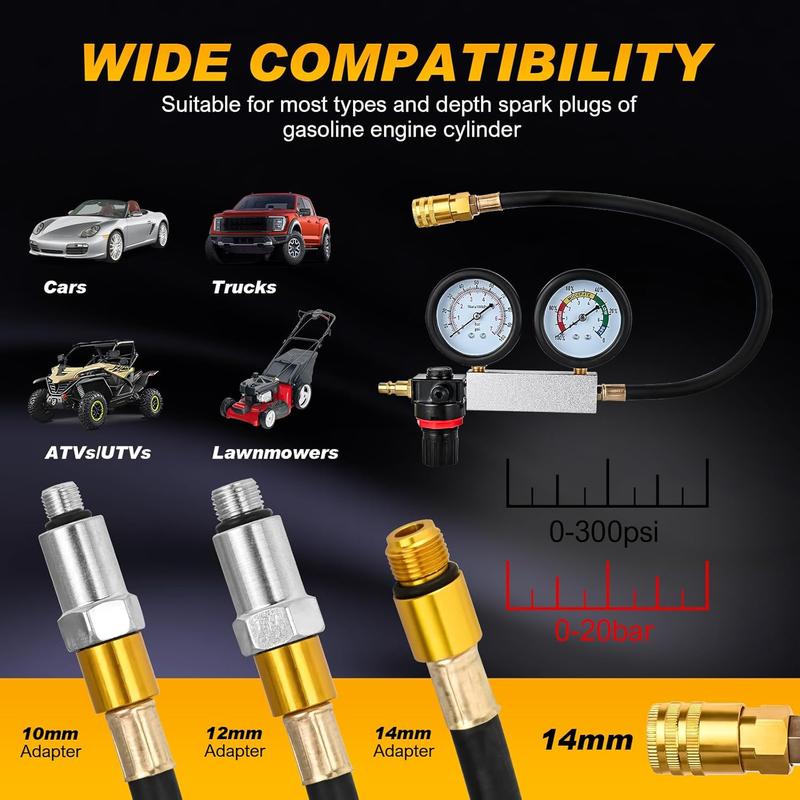 ·Wide Applications: Ideal for testing trucks and cars where clearance is minimal. The leak down tester automotive tool is suits all local and imported cars and trucks, it's compatible with any gasoline engine featuring 10mm, 12mm, or 14mm spark plugs