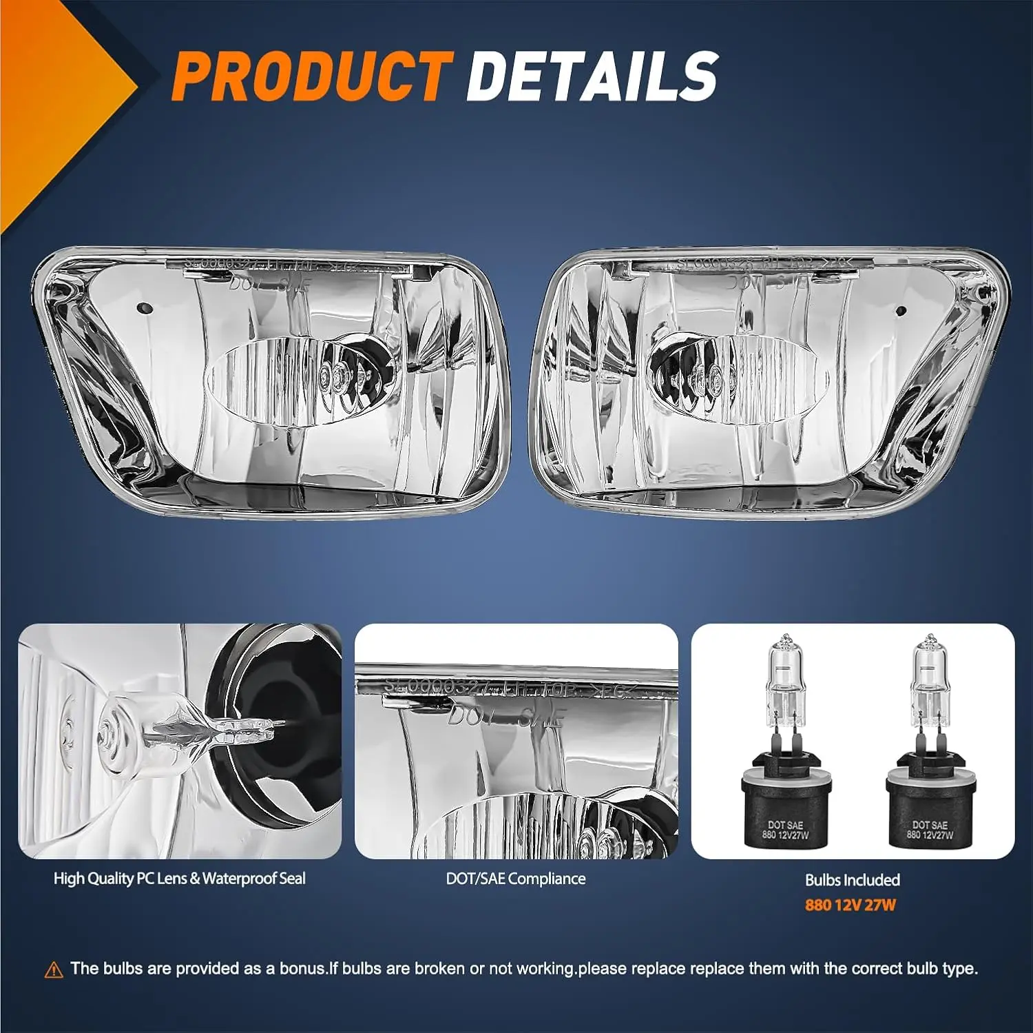 ·Packages Includes: A pair of fog lights (driver's side and passenger's side) with 880 bulbs. Professional installation is highly recommended.