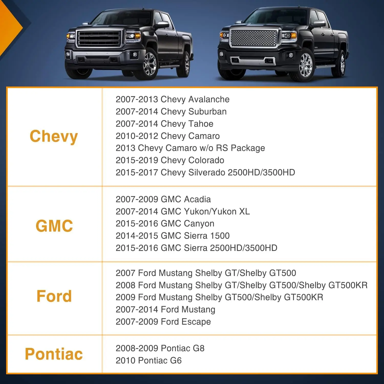 ·Fitment:The fog lights are compatible with 2007-2013 Chevy Avalanche 2010-2013 Chevy Camaro 2007-2014 Chevy Suburban 2007-2014 Chevy Tahoe 2015-2019 Chevy Colorado 2015-2017 Chevy Silverado 2007-2012 GMC Acadia 2007-2014 GMC Yukon 2008-2013 GMC Yukon Denali 2007-2014 GMC Yukon XL 2015-2016 GMC Canyon 2014-2016 GMC Sierra / Denali 2007-2014 Ford Mustang 2007-2010 Ford Escape 2008-2010 Ford Explorer Sport Trac 2007-2010 Ford Escape Hybrid 2008-2009 Pontiac G8 2010 Pontiac G6 All Models.