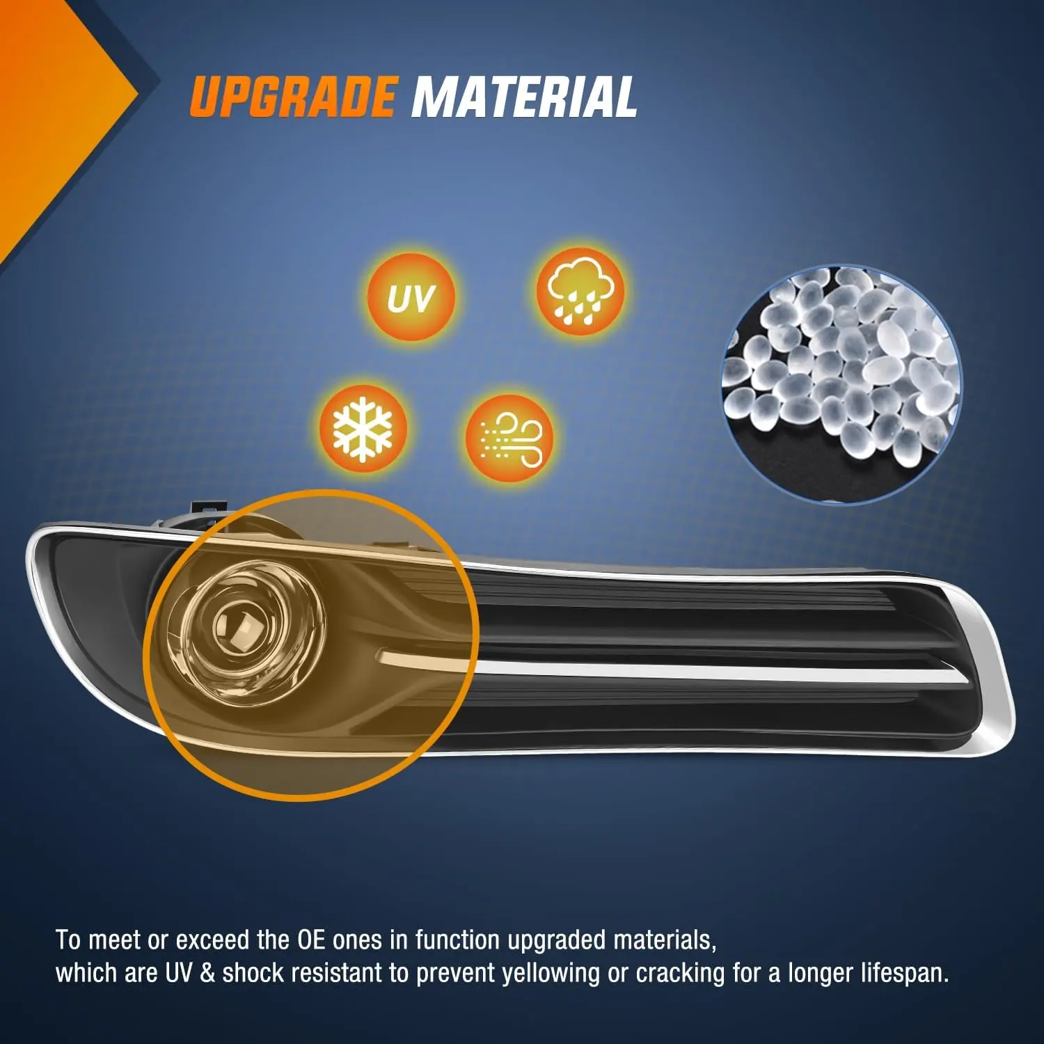 To meet or exceed the OE ones in function upgraded materials, which are UV & shock-resistant to prevent yellowing or cracking for a longer lifespan.
