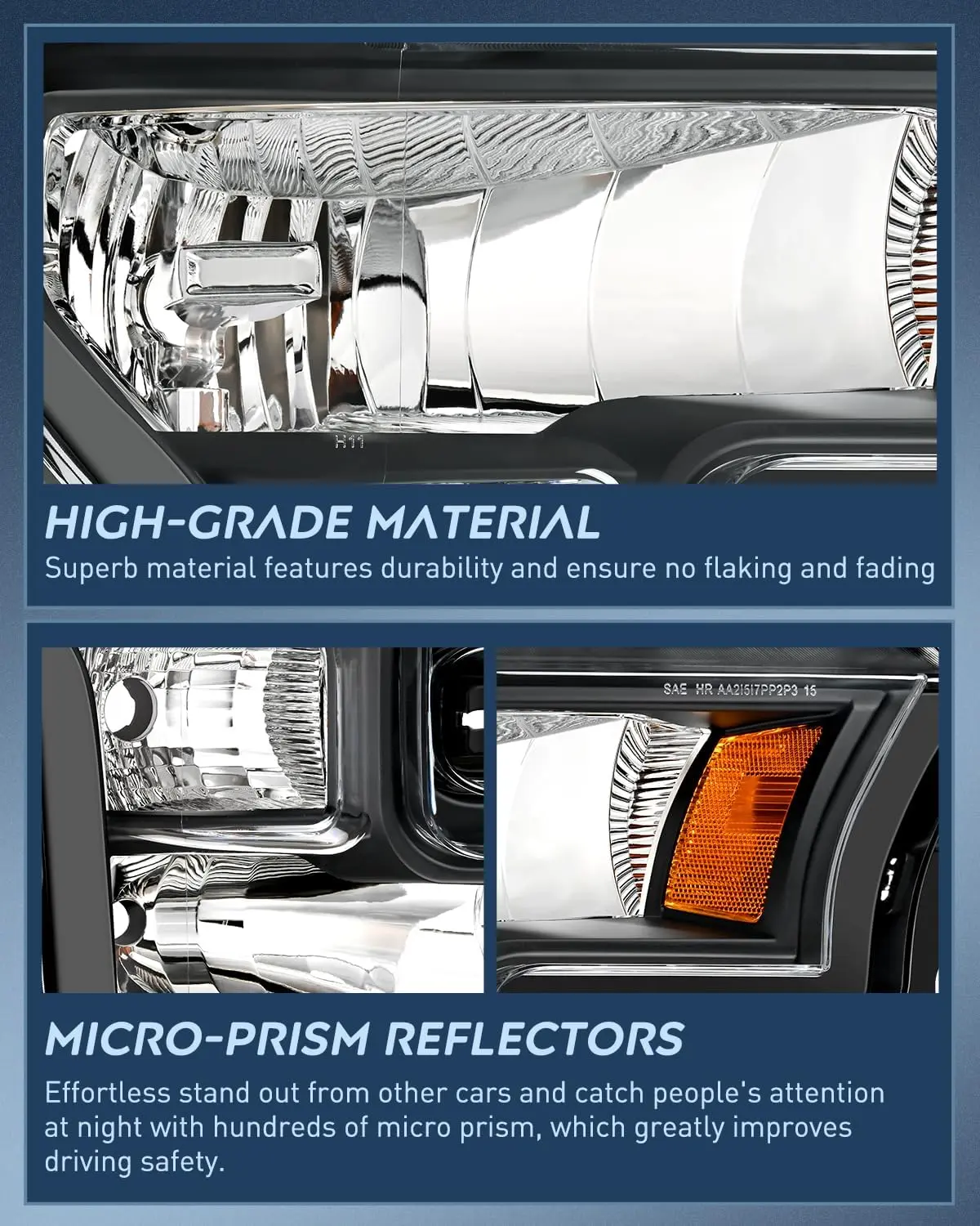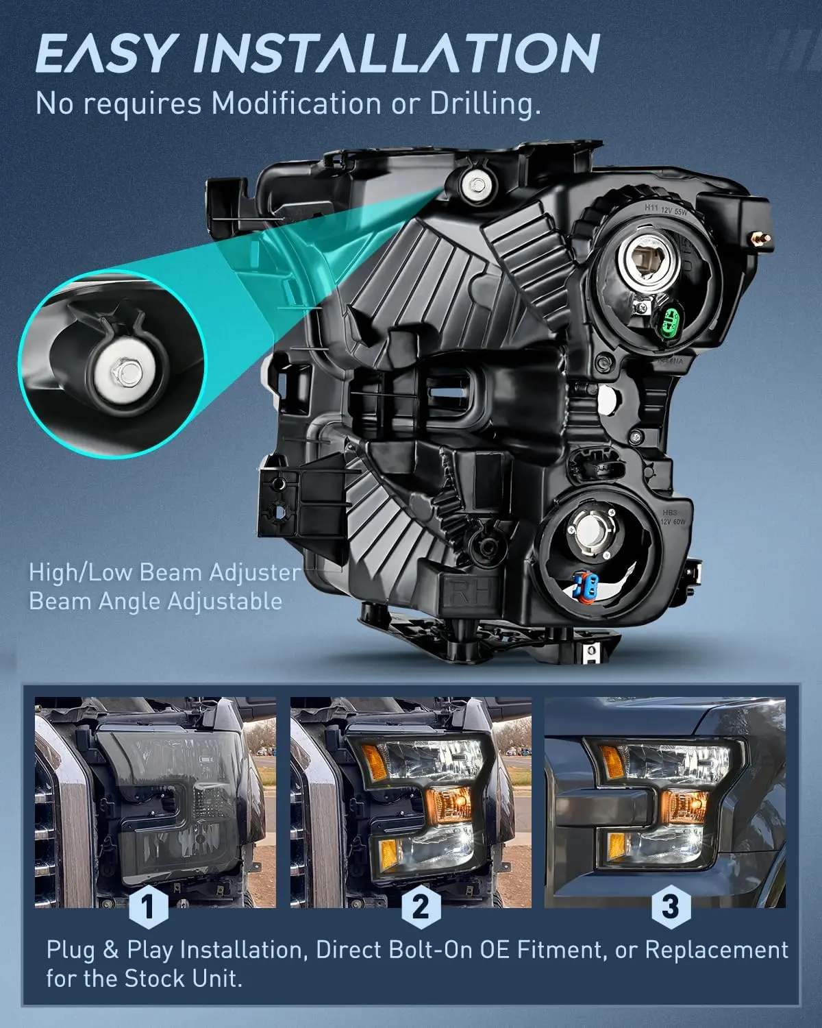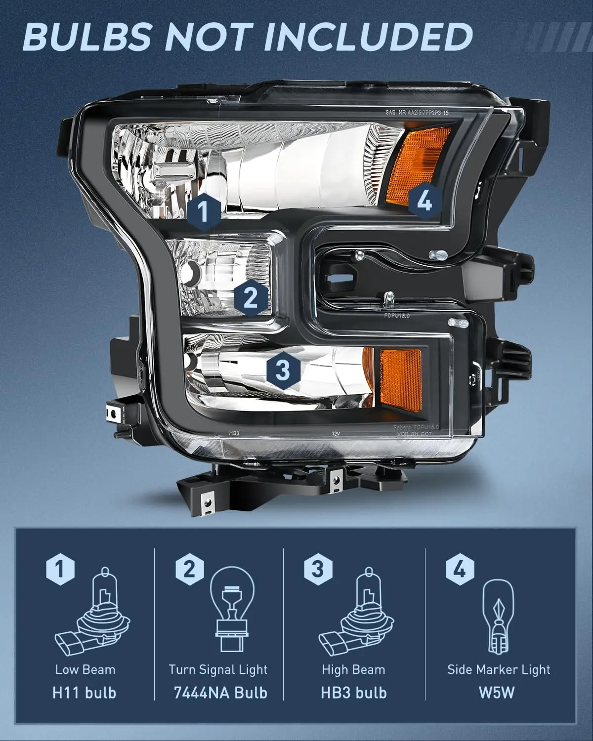 ·Compatibility:The headlight assemblies are compatible with 2015 2016 2017 Ford F-150 (Not compatible on models with LED or HID headlights). High beam /Low beam bulb type: HB3/H11(Bulbs are not included), Turn signal light: 7444A(bulbs are not included), use Stock Bulbs for installation