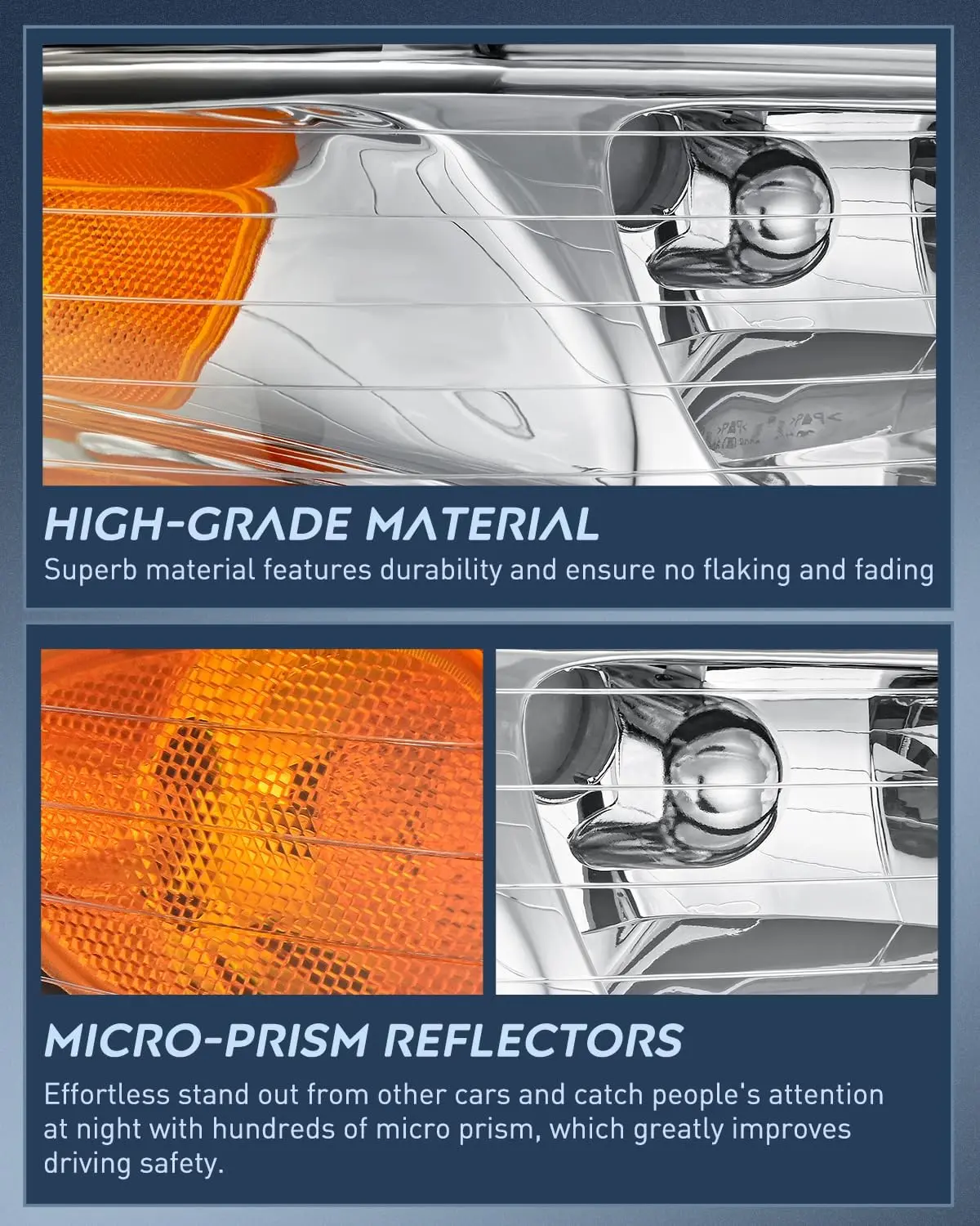 To meet or exceed the OE ones in function upgraded materials, which are UV & shock-resistant to prevent yellowing or cracking for a longer lifespan