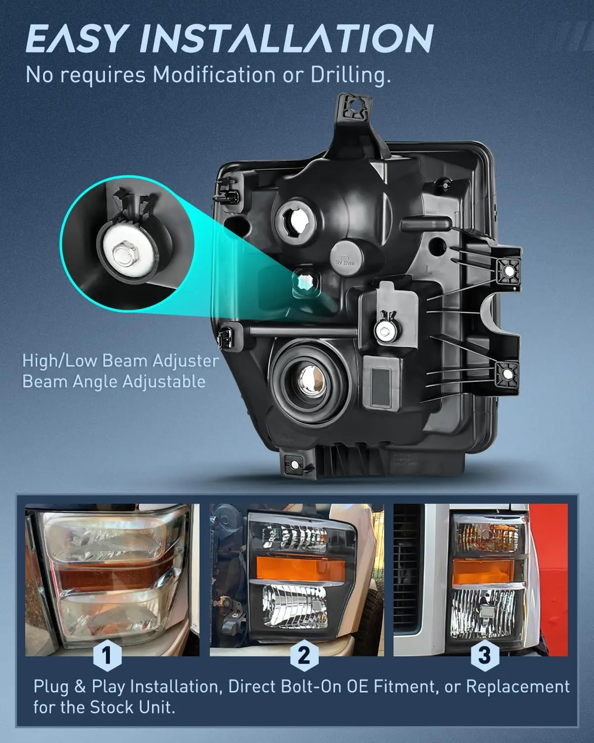 ·Compatibility:The headlight assemblies are compatible with 2008 2009 2010 Ford F250 F350 F450 Super Duty, (not compatible on models with sealed beam headlights). High beam /Low beam bulb type: H13(Bulbs are not included), Turn signal light: 3157NA(bulbs are not included), use Stock Bulbs for installation