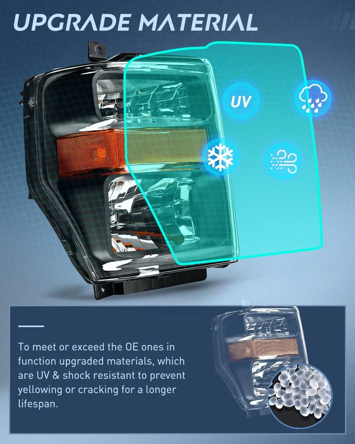 To meet or exceed the OE ones in function upgraded materials, which are UV & shock-resistant to prevent yellowing or cracking for a longer lifespan