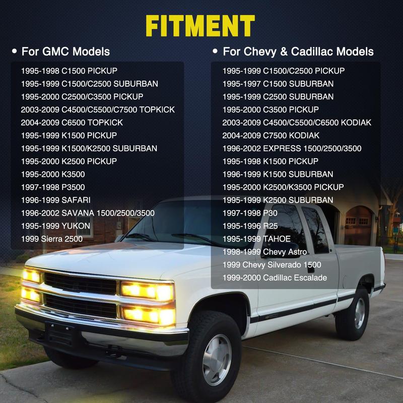 ·For Chevy & Cadillac: 1995-1999 Chevy C1500/C2500 Pickup, 1995-1997 Chevy C1500 Suburban, 1995-1999 Chevy C2500 Suburban, 1995-2000 Chevy C3500 Pickup 2003-2009 Chevy C4500/C5500/C6500 Kodia, 2004-2009 Chevy C7500 Kodiak, 1996-2002 Chevy Express 1500/2500/3500, 1995-1998 Chevy K1500 Pickup, 1996-1999 Chevy K1500 Suburban, 1995-2000 Chevy K2500/K3500 Pickup 1995-1999 Chevy K2500 Suburban, 1997-1998 Chevy P30, 1995-1996 Chevy R25, 1995-1999 Chevy Tahoe, 1998-1999 Chevy Astro, 1999 Chevy Silverado 1500, 1999-2000 Cadillac Escalade.