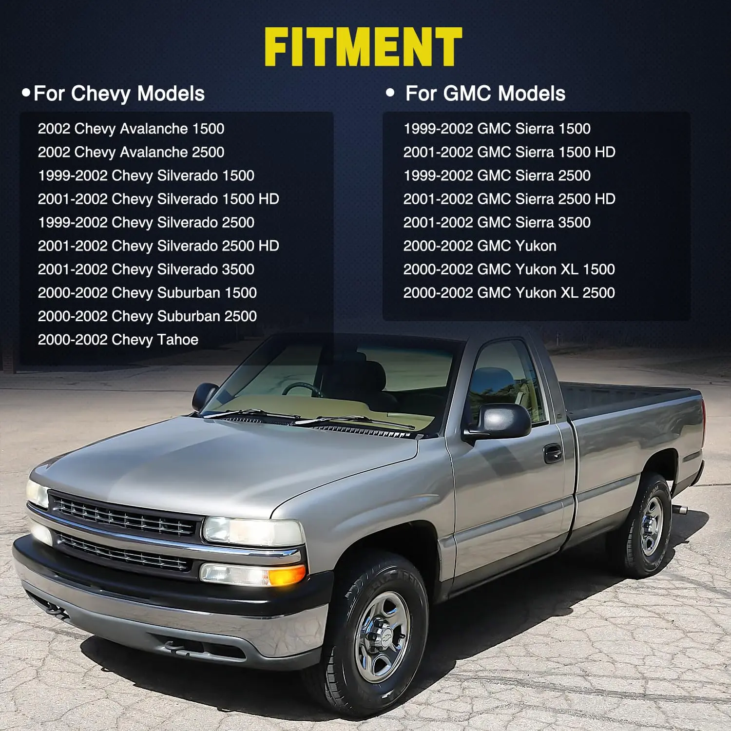 ·Vehicle Fitment: 2002 Chevy Avalanche 1500,2002 Chevy Avalanche 2500,1999-2002 Chevy Silverado 1500,2001-2002 Chevy Silverado 1500 HD,1999-2002 Chevy Silverado 2500,2001-2002 Chevy Silverado 2500 HD,2001-2002 Chevy Silverado 3500,2000-2002 Chevy Suburban 1500,2000-2002,Chevy Suburban 2500,2000-2002 Chevy Tahoe,1999-2002 GMC Sierra 1500,2001-2002 GMC Sierra 1500 HD,1999-2002 GMC Sierra 2500,2001-2002 GMC Sierra 2500 HD,2001-2002 GMC Sierra 3500,2000-2002 GMC Yukon,2000-2002 GMC Yukon XL 1500,2000-2002 GMC Yukon XL 2500.