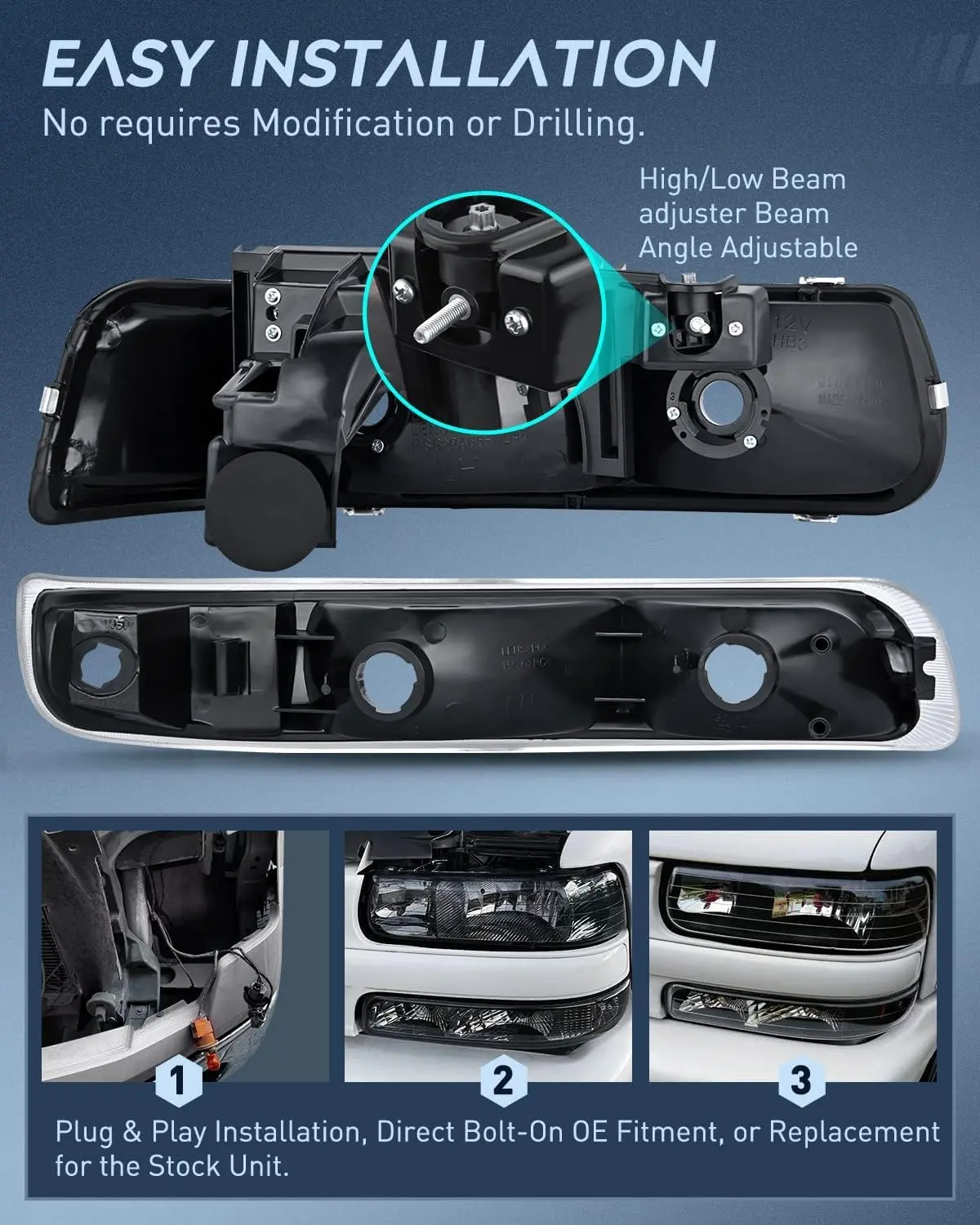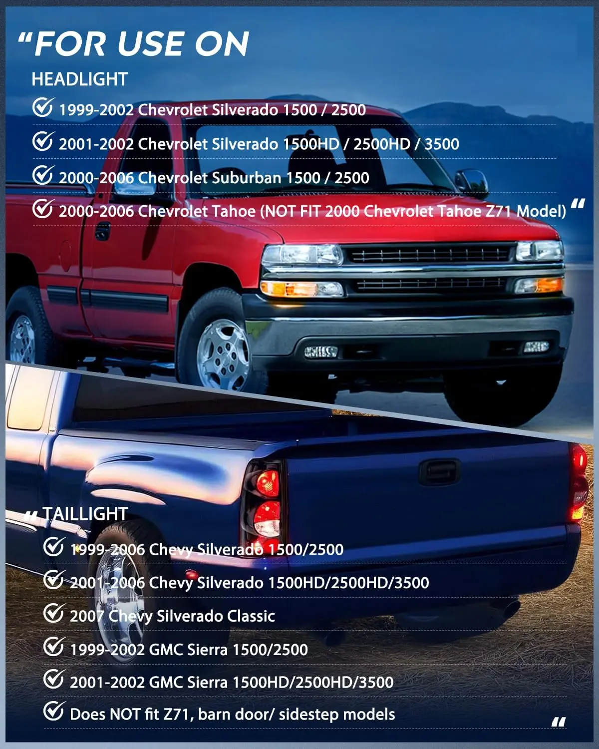 ·Compatibility: The headlight and taillight assemblies are compatible with 1999-2002 Chevy Silverado 1500;2001-2002 Chevy Silverado 1500HD;1999-2002 Chevy Silverado 2500;2001-2002 Chevy Silverado 2500HD;2001-2002 Chevy Silverado 3500. Not suitable for Barn Door, Stepside models. Not suitable for chevy tahoe. Please confirm the vehicle fitment before ordering