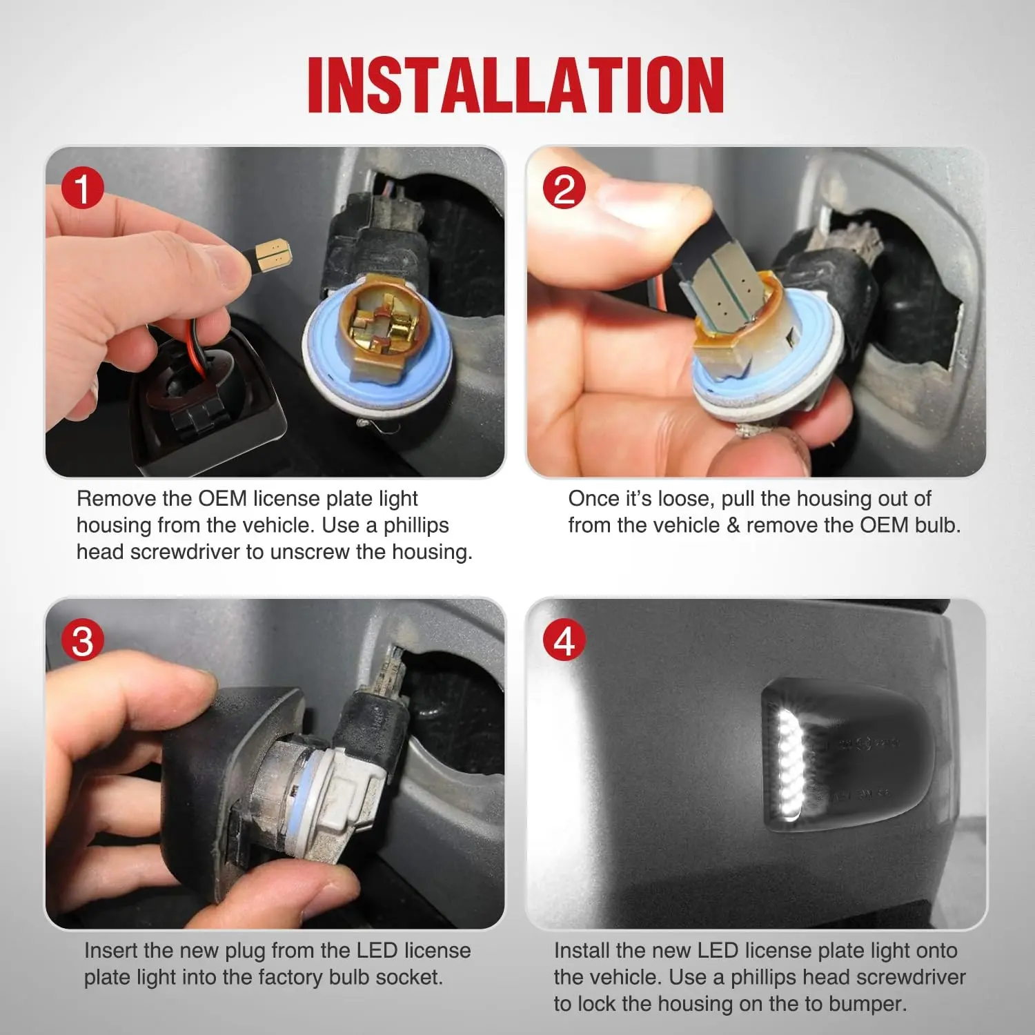 Install the new LED license plate light onto the vehicle. Use a phillips head screwdriver to lock the housing on the to bumper.