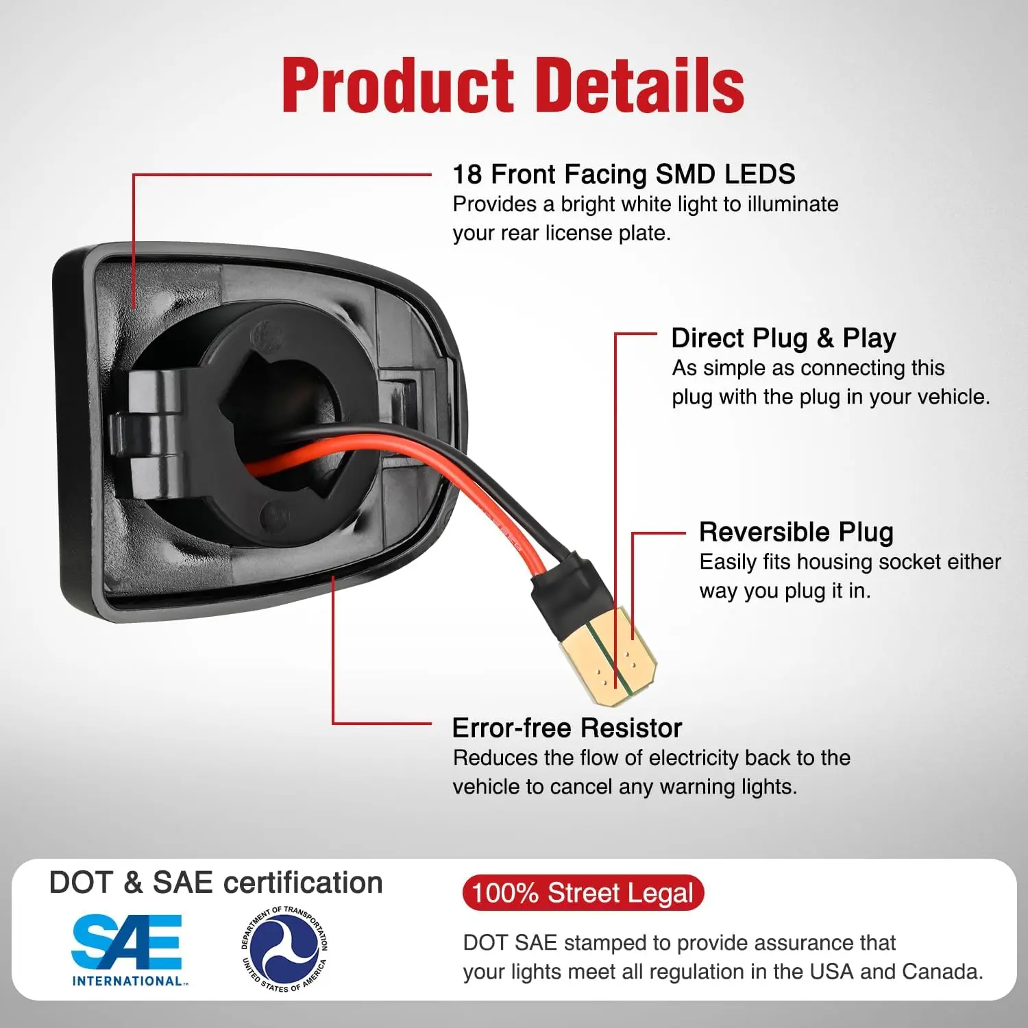 Built-in high power 18 SMD LED chips, super bright 6000k white light output effectively illuminate the license plate. LED license plate lights ensure that your license plate tag lights remain visible in low light and nighttime conditions.