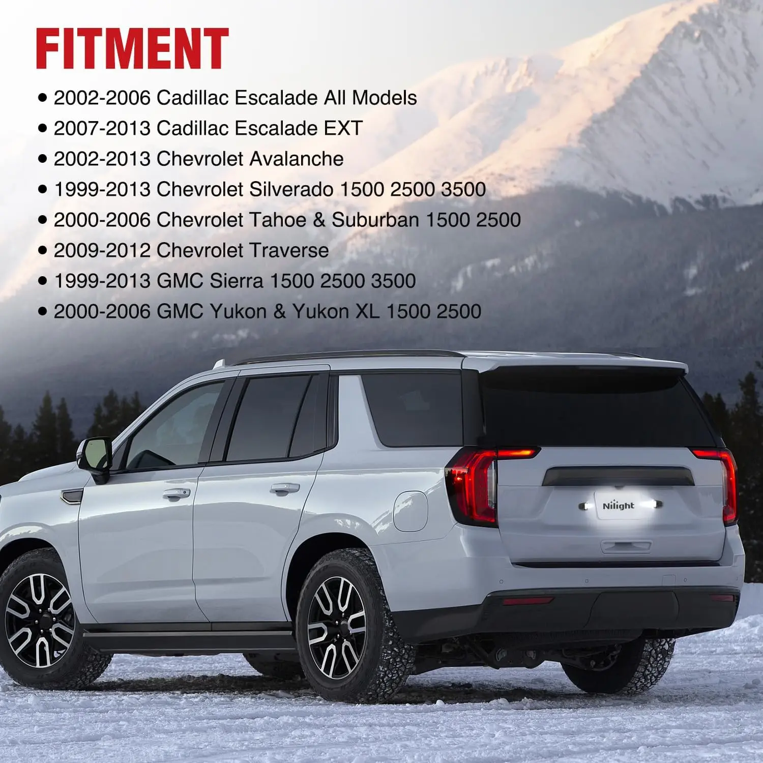 ·Vehicle fitment: The License Plate Light Lamp Compatible with 2002-2006 Cadillac Escalade All Models; 2007-2013 Cadillac Escalade EXT; 2002-2013 Chevy Avalanche; 1999-2013 Chevy Silverado 1500 2500 3500; 2000-2006 Chevy Tahoe & Suburban 1500 2500; 2009-2012 Chevy Traverse; 1999-2013 GMC Sierra 1500 2500 3500; 2000-2006 GMC Yukon & Yukon XL 1500 2500. Please confirm the vehicle fitment before ordering.