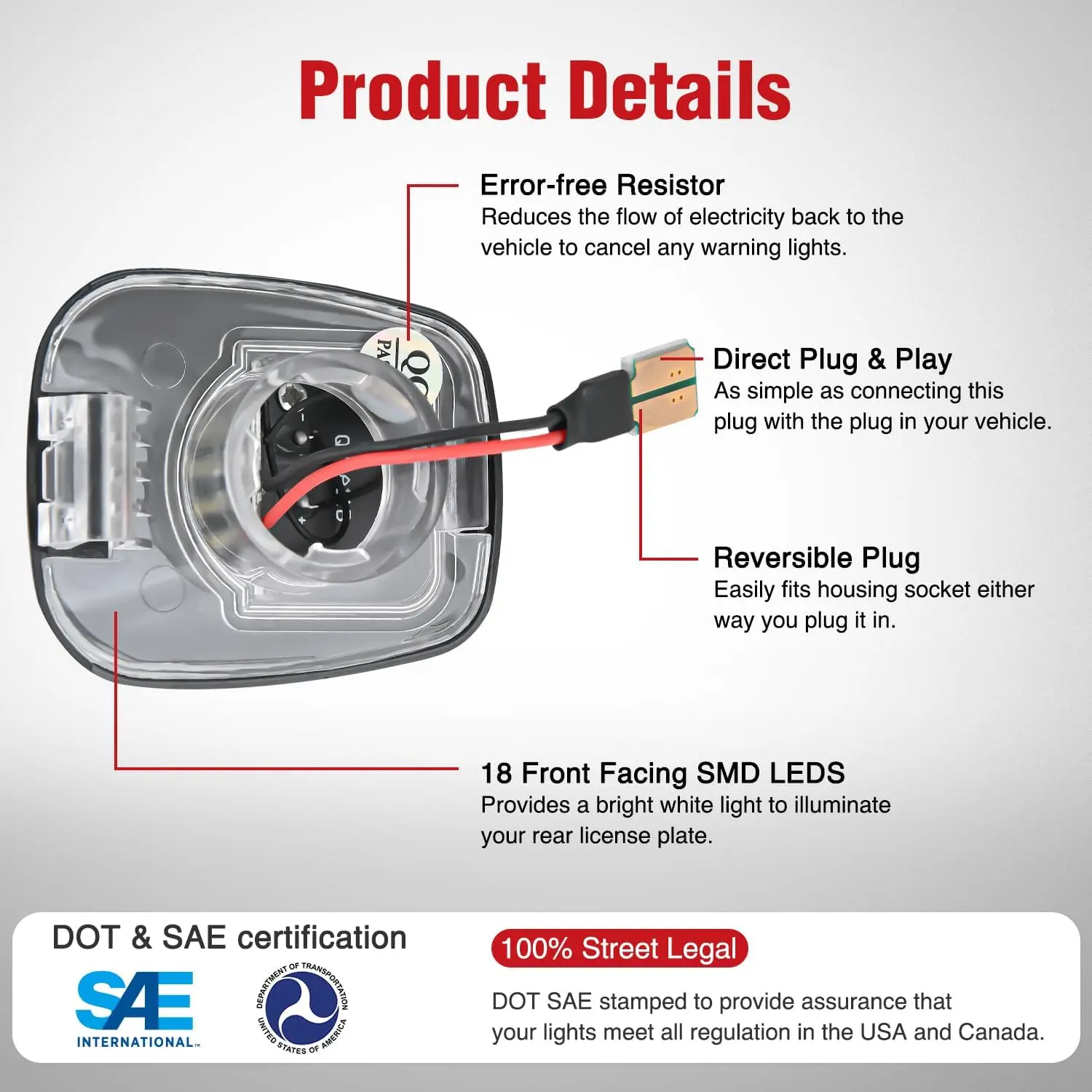 Built-in high power 18 SMD LED chips, super bright 6000k white light output effectively illuminate the license plate.led license plate light ensures that your Nissan & Suzuki license plate tag light remains clearly visible in low light and nighttime conditions.