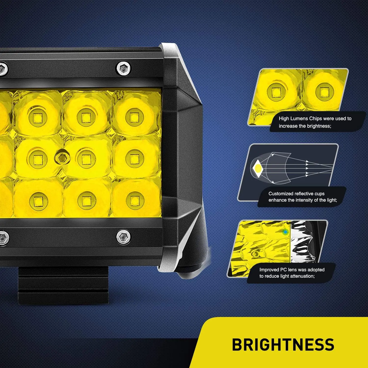 Special tri-row design contains more LED chips than dual rows light bars in the same sized. Spot beam nest reflector cup design can focus more effective light.