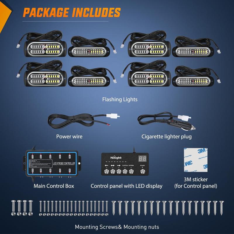 ·Super Bright and High Visiblity: Nilight 8Pcs Surface Mount Strobe Lights are consists of 4pcs single row 12 LED chips and 4pcs double row 24 LED chips. provided maximum illuminate coverage and be visible from greater distance. Visible in daylight, midnight, rainy, foggy or snow days