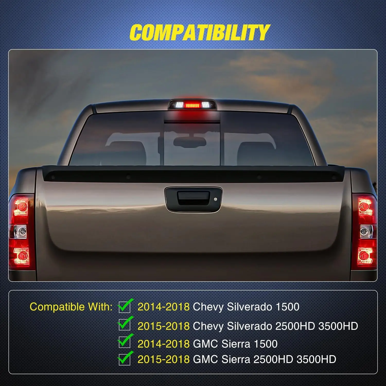 ·【Compatible with】2014-2018 Chevy Silverado 1500; 2015-2018 Chevy Silverado 2500HD 3500HD; 2014-2018 GMC Sierra 1500; 2015-2018 GMC Sierra 2500HD 3500HD. Fits Models with Cargo Lights Only