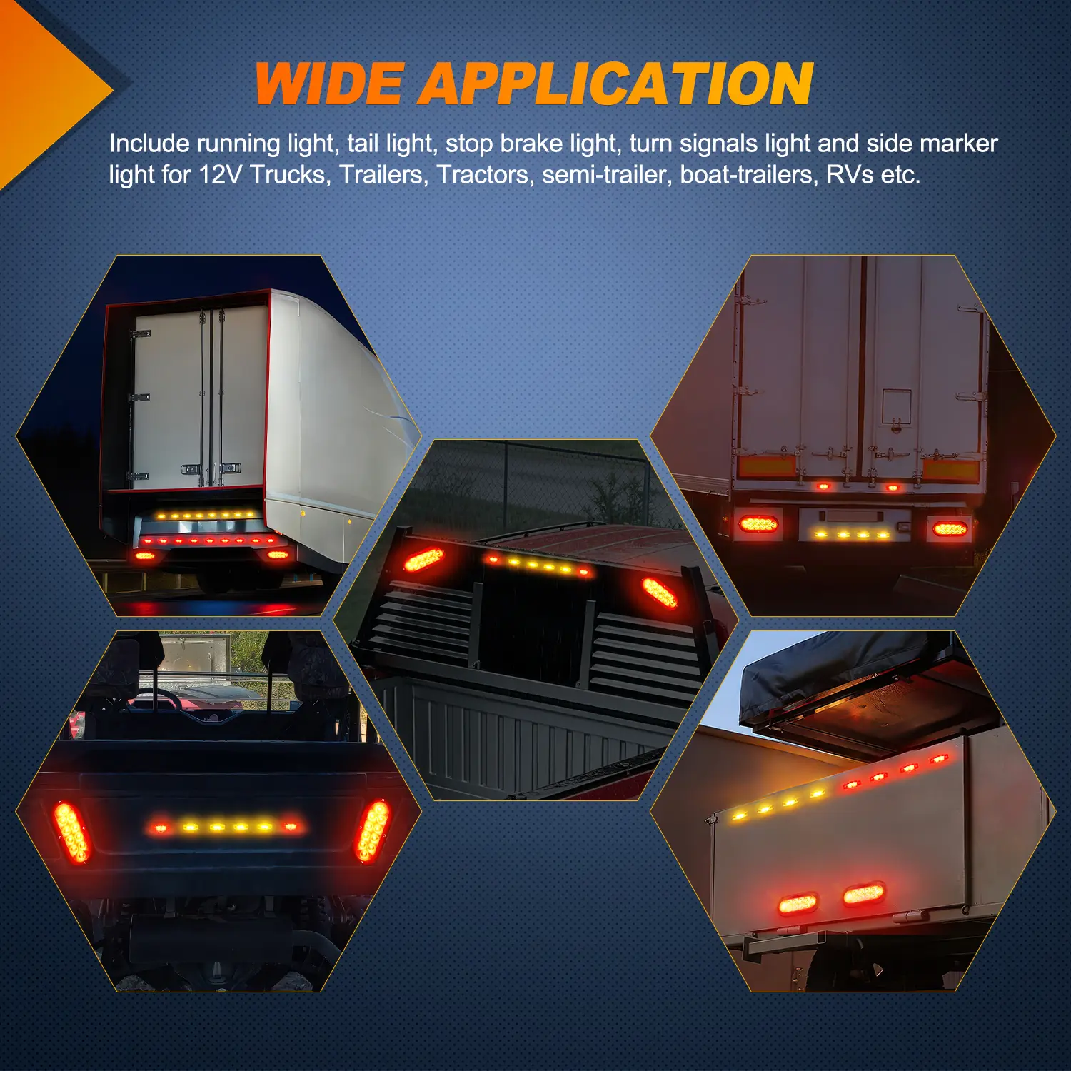 ·Package Include: 2pcs 6inch 10LED oval tail light, 2pcs 2.5inch red and 6pcs 2.5nch amber side marker light, 24pcs self tapping screws