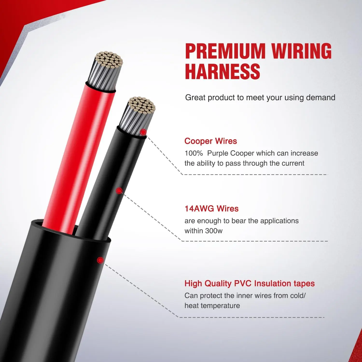With two sets of light output connectors, the wiring harness can hook up two LED lights within 300W at the same time.
