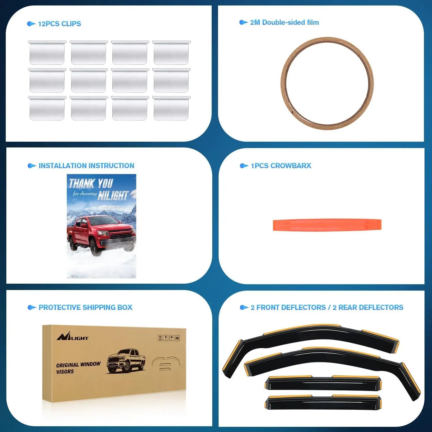 ·IMPROVE DRIVING EXPERIENCE:Nilight window deflectors are great for all weather conditions,help improve ventilation inside and outside your car to reduce mirror and window fogging while increasing air circulation。With our side window deflectors, it deflects the rain and noise away from your windows to make your driving more enjoyable
