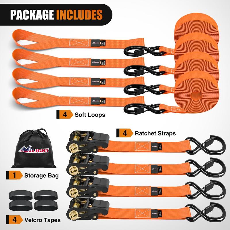 ·【Kit Included】 4Pcs 1”×15’Ratchet Straps, 4Pcs 1”×12’Soft Loops, 1Pcs Storage Bag, 1Pcs Instruction, 2-year 100% satisfaction after-sales service. If you have any questions during the warranty period, please contact us.