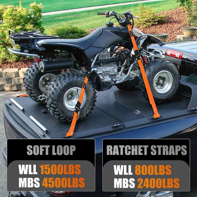 ·【Multi-application】Ratchet straps can be used for a variety of purposes and are ideal for securing vehicles of all sizes - motorcycles, bicycles, Kayaks, UTVs, Boats, ATVs. They're also great for securing cargo to trailers, roof racks, or even used as truck straps.
