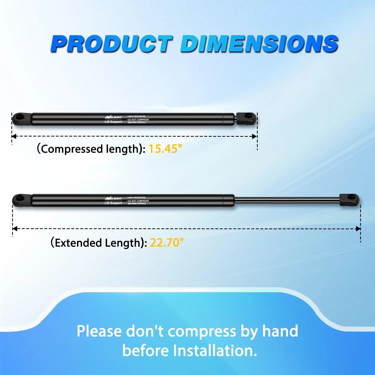 ·Size and Performance: Compressed length-15.45 inches, Extended length-22.7 inches. Our liftgate struts have high-strength leak-proof structure, and have undergone 45,000 fatigue tests, with a service life of up to 80, 000 openings and closings.