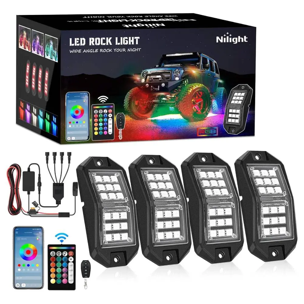 Offers millions of different colors with brightness adjustment. The RGB rock light come with 12 pcs bright and durable 5050 LEDs, freely choose and set the colors through the remote or bluetooth APP.