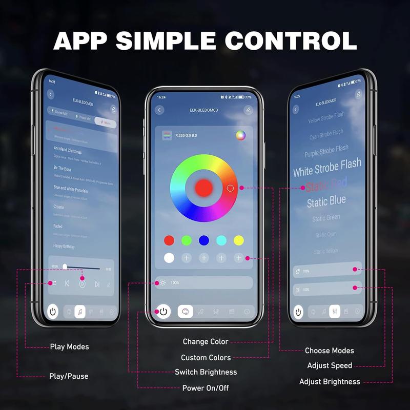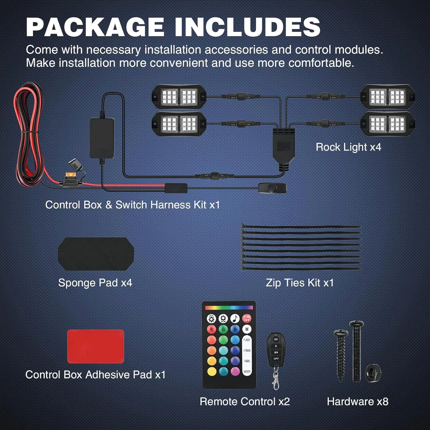 Offers millions of different colors with brightness adjustment. The RGB rock light come with 12 pcs bright and durable 5050 LEDs, freely choose and set the colors through the remote or bluetooth APP.