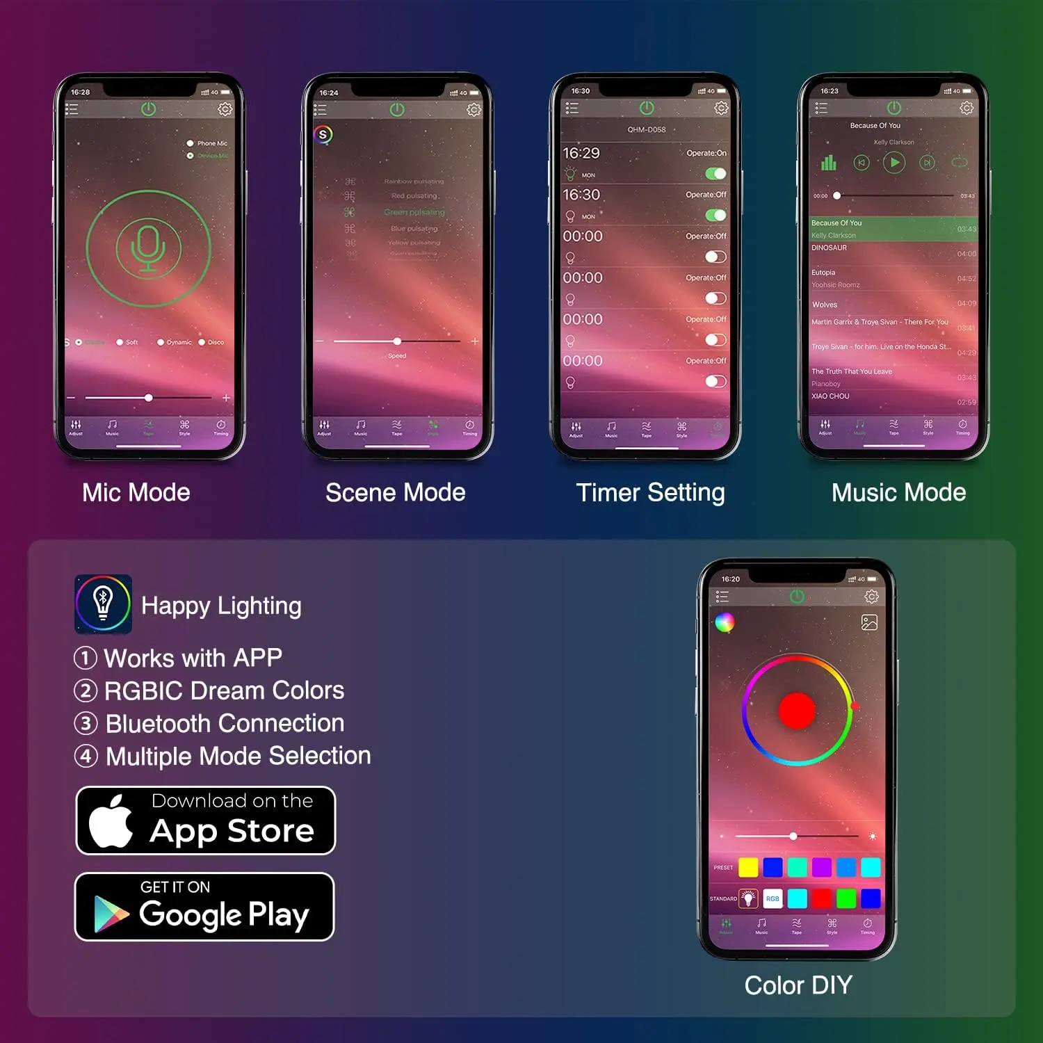 With the mobile APP control, you can change the mode and adjust the brightness as needed. It also synchronizes outside sounds through the sensitive microphone, the light will change automatically with the rhythm of music or sound.