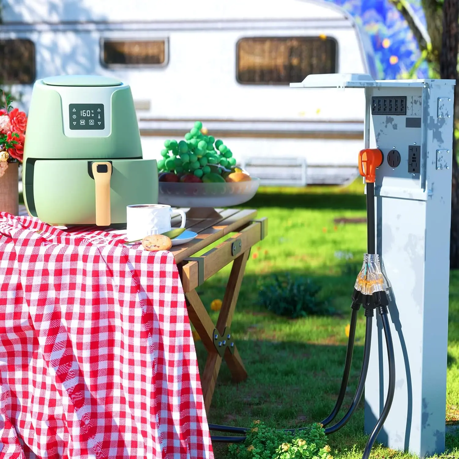 Usually plugs into the power source of the campground, generator or the TT-30 power outlet box.