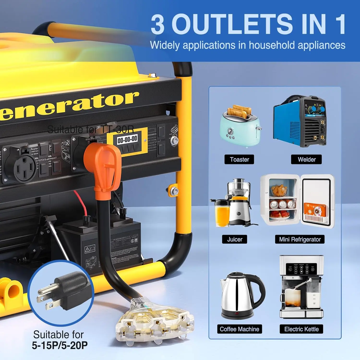 ·30 to (3) 15/20 Amp Adapter: Allows you to connect from a 30AMP external receptacle at RV Park or Campground to a 15 AMP or 20 AMP service in or out of your RV, which quickly supplies power for the refrigerator, air conditioner, microwave oven, roaster and other 110V household appliances. This distribution adapter power cord provides an easy way to gain 3X 5-15R/5-20R receptacles from a NEMA TT-30P outlet. Allows to go directly from 30 to 15/20 amp outlets. A good choice have on the road, it gives you a option to hook 3 applicances into one power outlet.