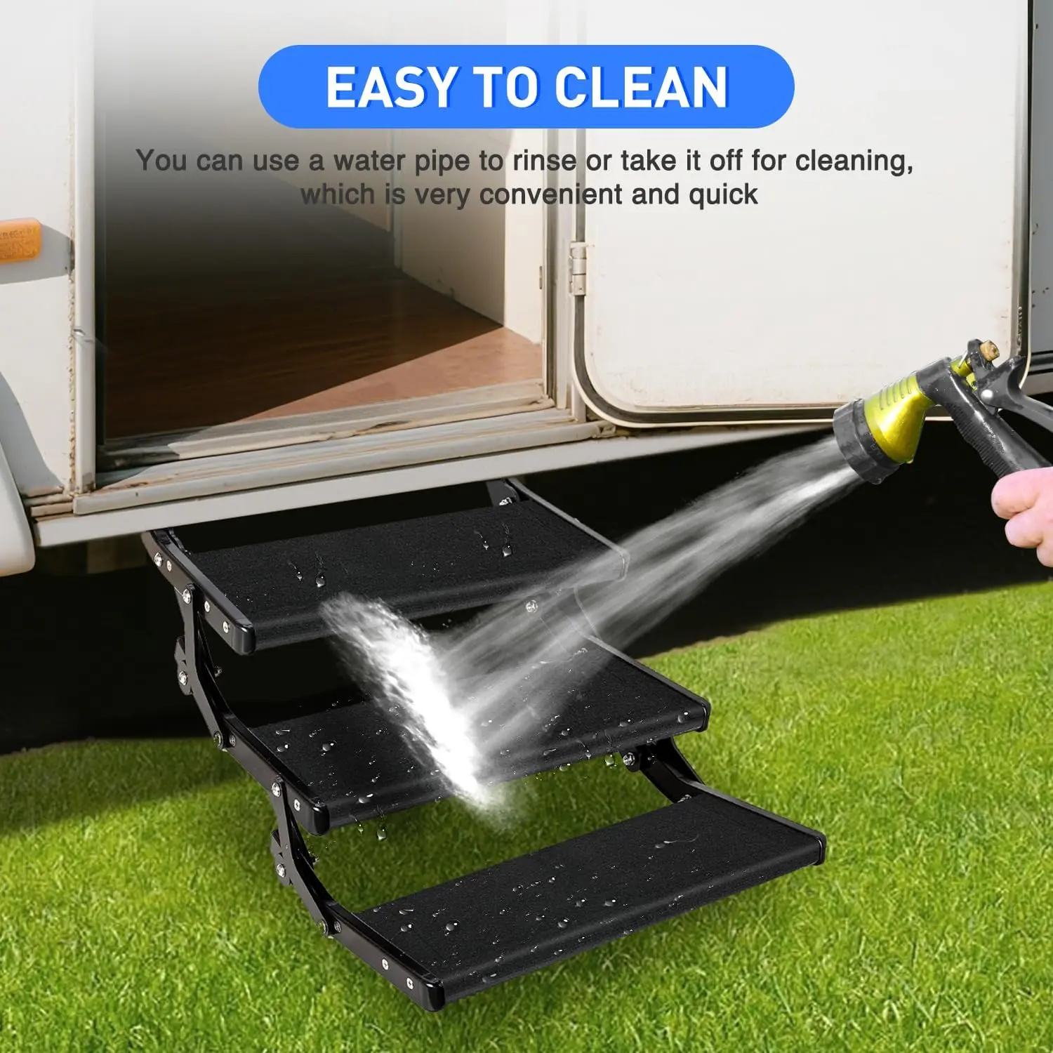 ·EASY CLEANING & PACKAGE CONTENTS – Remove the rv step cover for easy cleaning by rinsing or soaking, which dries quickly and resists fading. Package includes 3x black camper stair covers and 12x stainless steel fixing springs