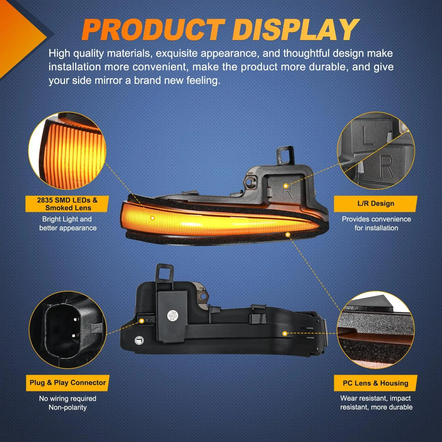 ·Plug & Play: Plug and Play connector, no need to wire. Can worked as amber sequential left/right turn signals light. Built in CANBUS. Make the lights work more stable, durable and long-lasting