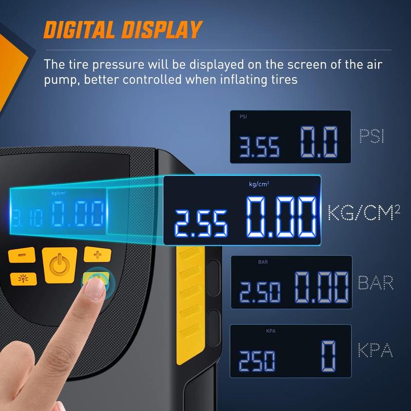 There are 4 pressure measurement units: PSI, KPA, BAR, and KG/CM². You can switch the units by pressing the "R" button below the screen. The tire pressure will be displayed on the screen of the air pump so that the pressure can be better controlled when inflating tires to ensure safety.