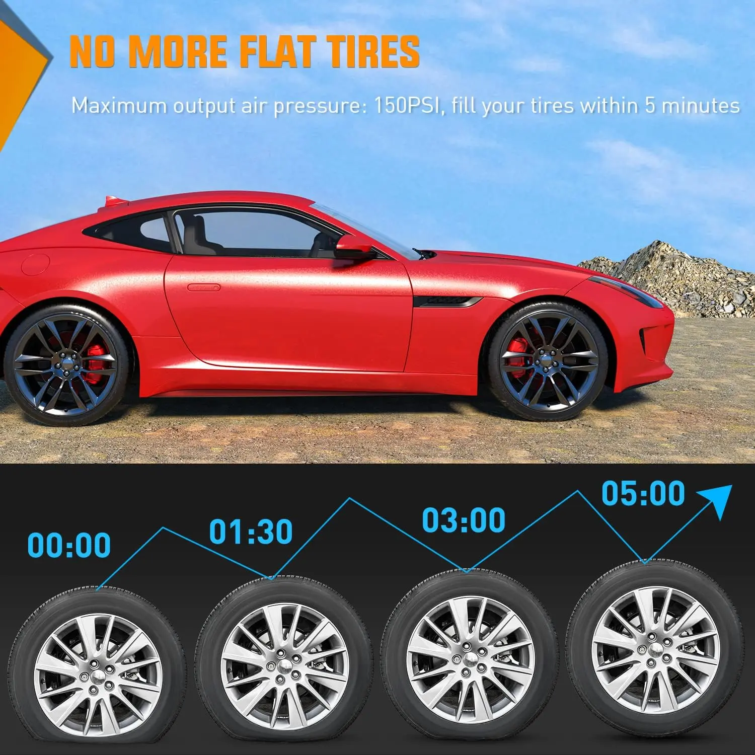·No More Flat Tires: Nilight Tire Pump can inflate the 195/55/R15 car tires from 0 to 35psi within 5 minutes and capable of providing a maximum pressure of 150 psi and an airflow of 35L/Min. Professionally inflate your flat tires and much more effective and faster than traditional tire pump. A great solution for emergency on the way.