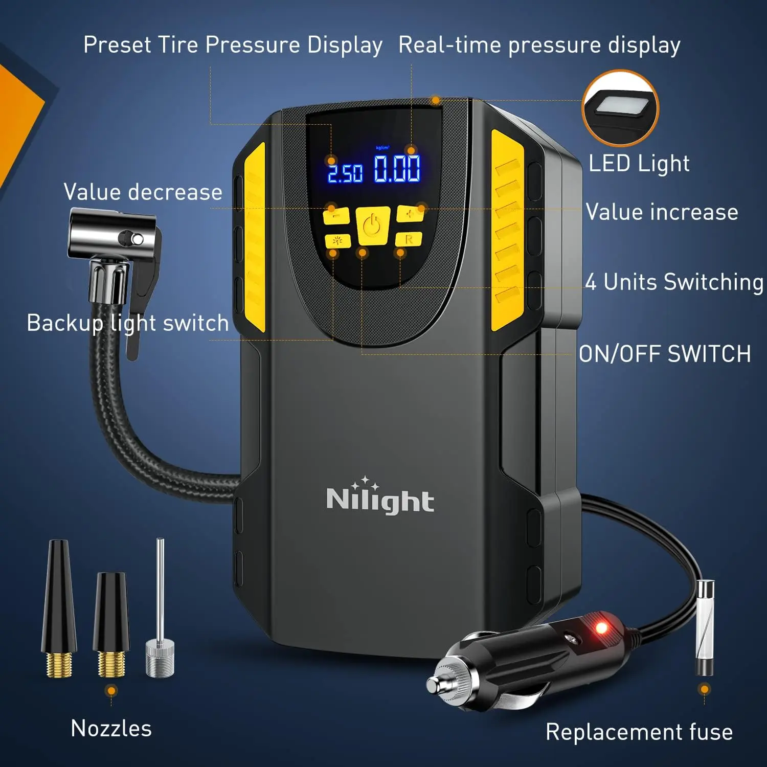 Nilight Tire Pump can inflate the 195/55/R15 car tires from 0 to 35psi within 5 minutes. Professionally inflate your flat tires much more effectively and faster than traditional tire pumps. Suitable for inflating tires on cars, MPVs, bikes, sedans, midsize SUVs, etc.