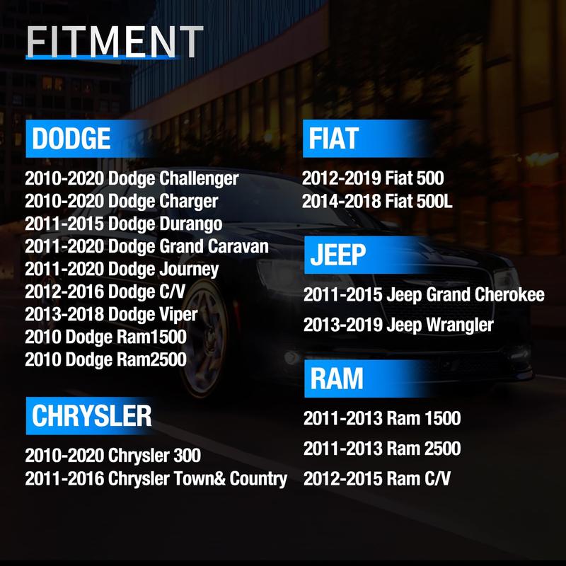 ·Vehicle Fitment: 2010-2020 Chrysler 300, 2011-2016 Chrysler Town& Country, 2010-2020 Dodge Challenger and Dodge Charger, 2011-2015 Dodge Durango, 2011-2020 Dodge Grand Caravan and Dodge Journey, 2012-2016 Dodge C/V, 2013-2018 Dodge Viper, 2010 Dodge Ram 1500 2500, 2011-2015 Jeep Grand Cherokee, 2013-2019 Jeep Wrangler, 2012-2019 Fiat 500, 2014-2018 Fiat 500L, 2011-2013 Ram 1500 2500 and 2012-2015 Ram C/V. Please check before purchasing.