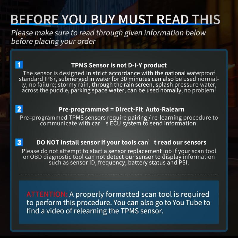 ·No programming: The tire pressure sensor is pre-programmed so there is no need to reprogram, but it requires relearning, and the tire pressure sensor is manufactured to OEM specifications and is very simple to install. Your vehicle only needs to pair and learn the new sensor after replacement with the TPMS enabled scanner tool.