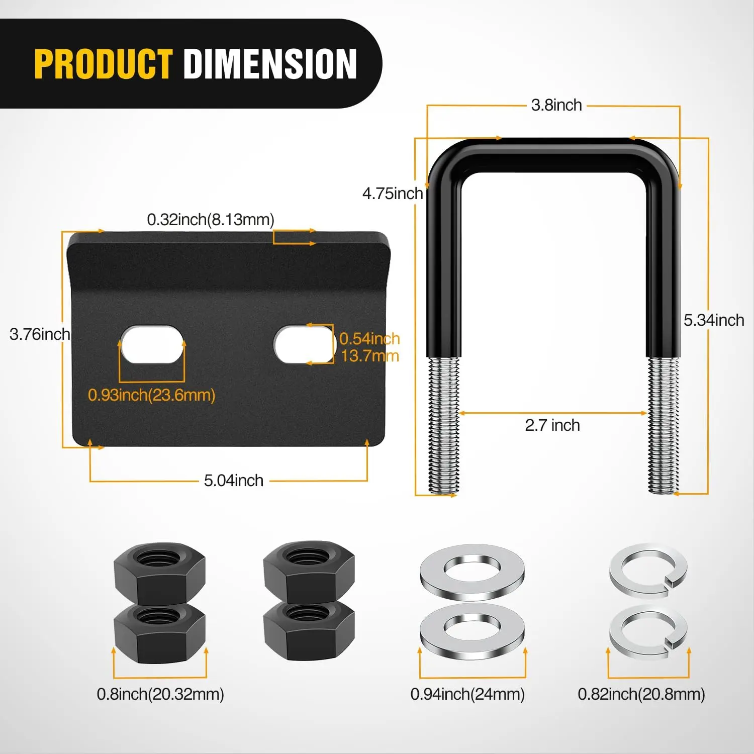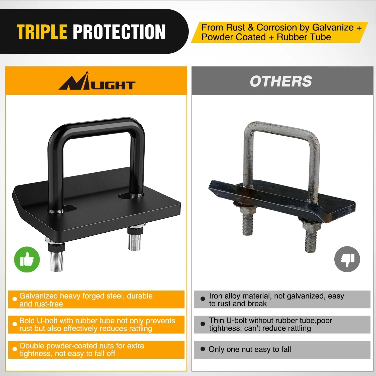 ·【EASY INSTALLATION】Simply slip the U-bolt over the receiver, slide the tightener plate into the bolt, and tighten into place with the included hardware. (Comes with installation instructions)