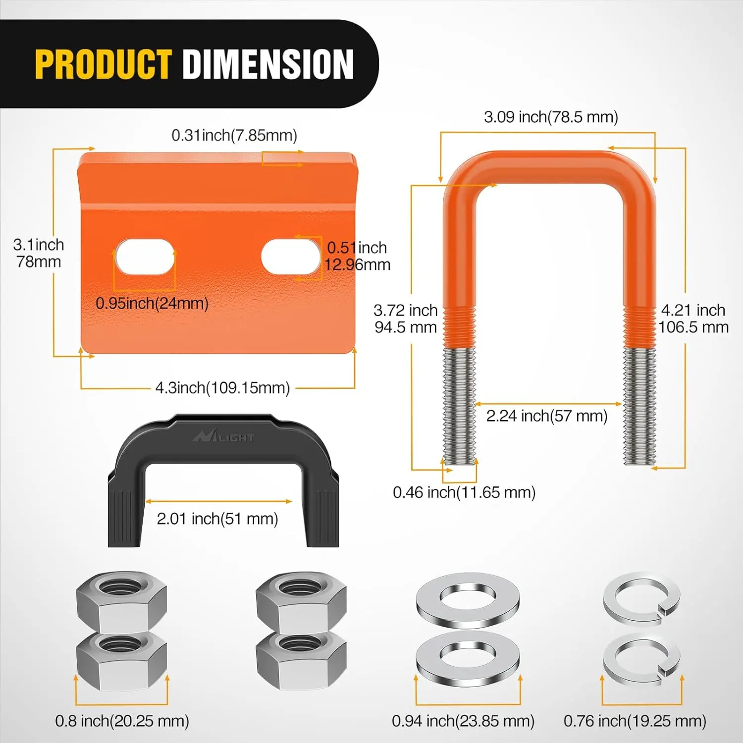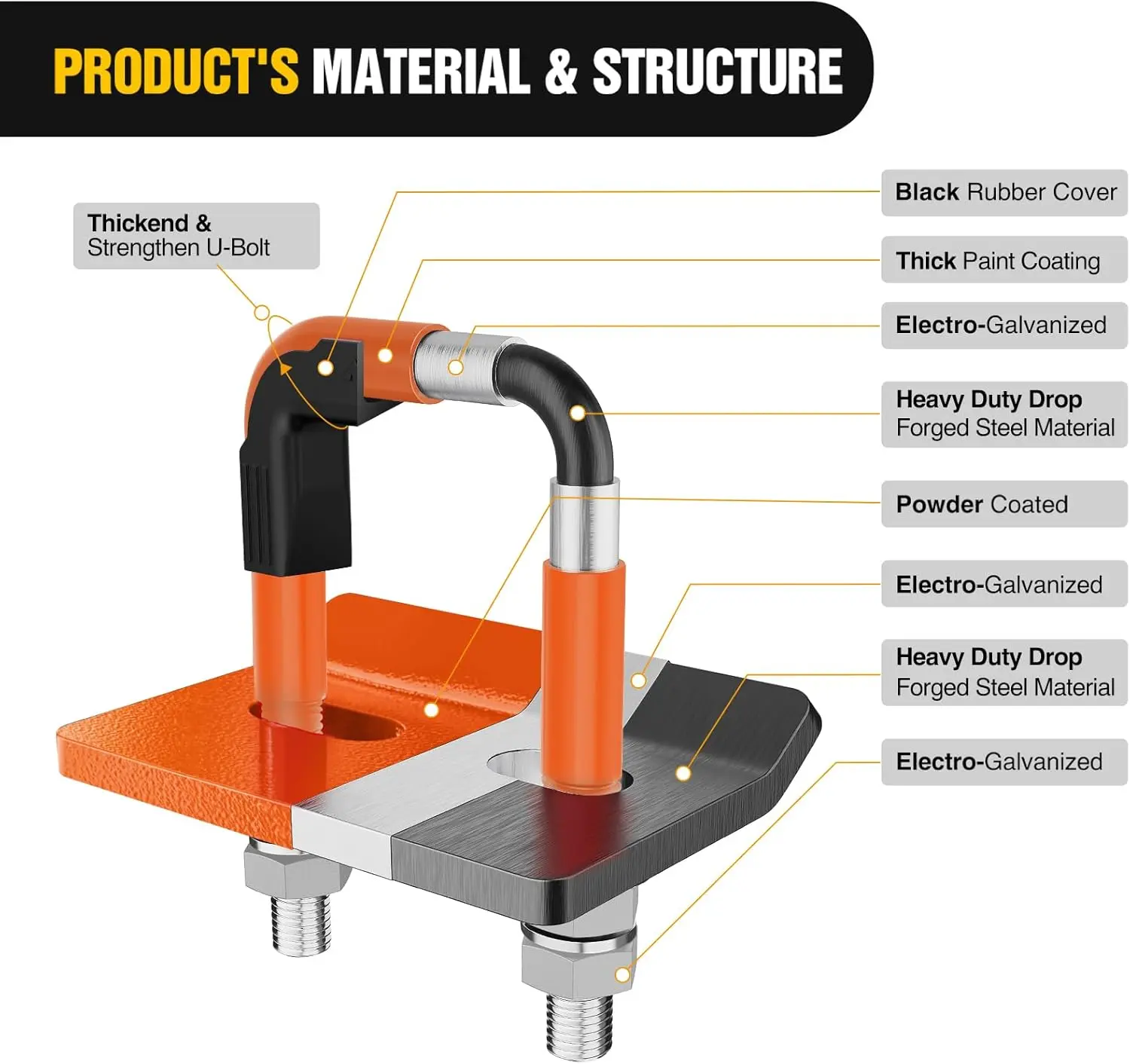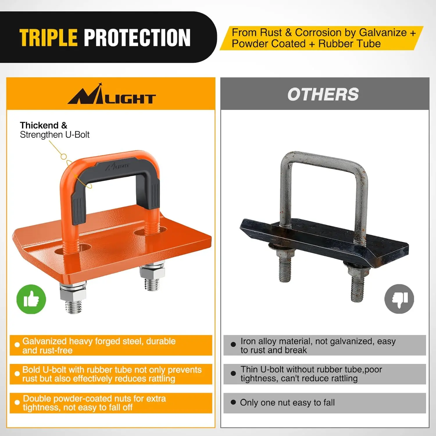 ·Upgrade Rubber Cover: Add rubber cover on a galvanize and powder coated U-bolt, which can reduce the risk of scratches, chipping and corrosion in any weather, extending the life of the kit