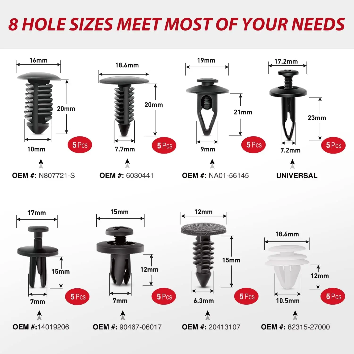 There are 8 most popular sizes clips for you, compatible with most of the auto cars