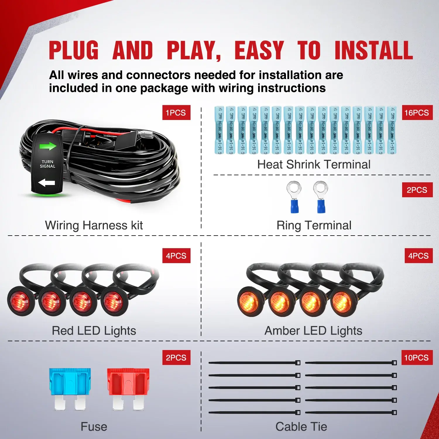 ·Package Include: 1x turn signal wiring harness kit, 4 x amber LED turn signal lights, 4 x red LED turn signal lights, 2x fuses, 16x heat shrink terminals, 2x ring terminals, 10x cable ties, 1x instruction. Note: If your power exceeds 12V, protect your turn signal kit with a voltage converter.