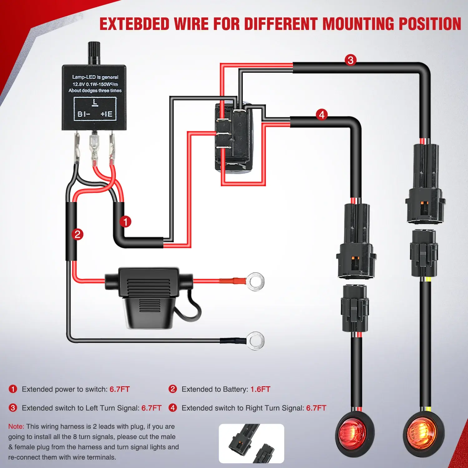 ·Easy To Install: This turn signal kit is plug-and-play and easy to install, all the accessories and components are pre-assembled. You just need to plug them into the corresponding interfaces and connect the vehicle 12V power supply to work. Note: This wiring harness is 2 leads with plug, if you are going to install all the 8 turn signals, please cut the male&female plug from the harness and turn signal lights and re-connect them with wire terminals.