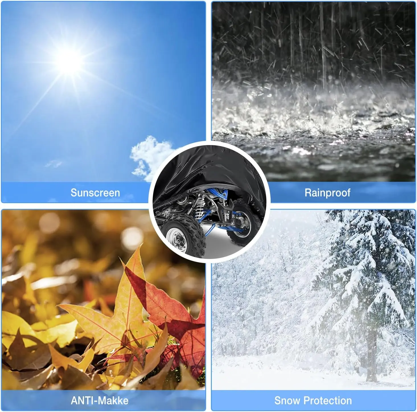 ·【All Weather Protection】This four wheeler cover can protects against every kind of weather and harmful UV rays, shelter your ATV from direct sun, rain, wind, snow, dust, storm etc. It prevents damage from dust, tree sap, bird dropping, and pollutants. It also can protect your vehicle's surface from being scratched by sharp objects