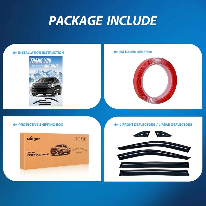 ·Multi-functional use: Nilight window visors effectively reduce wind noise and prevent mirror fogging while allowing fresh air into the car and keeping rain out