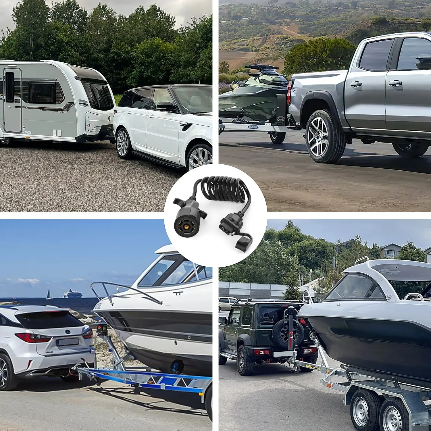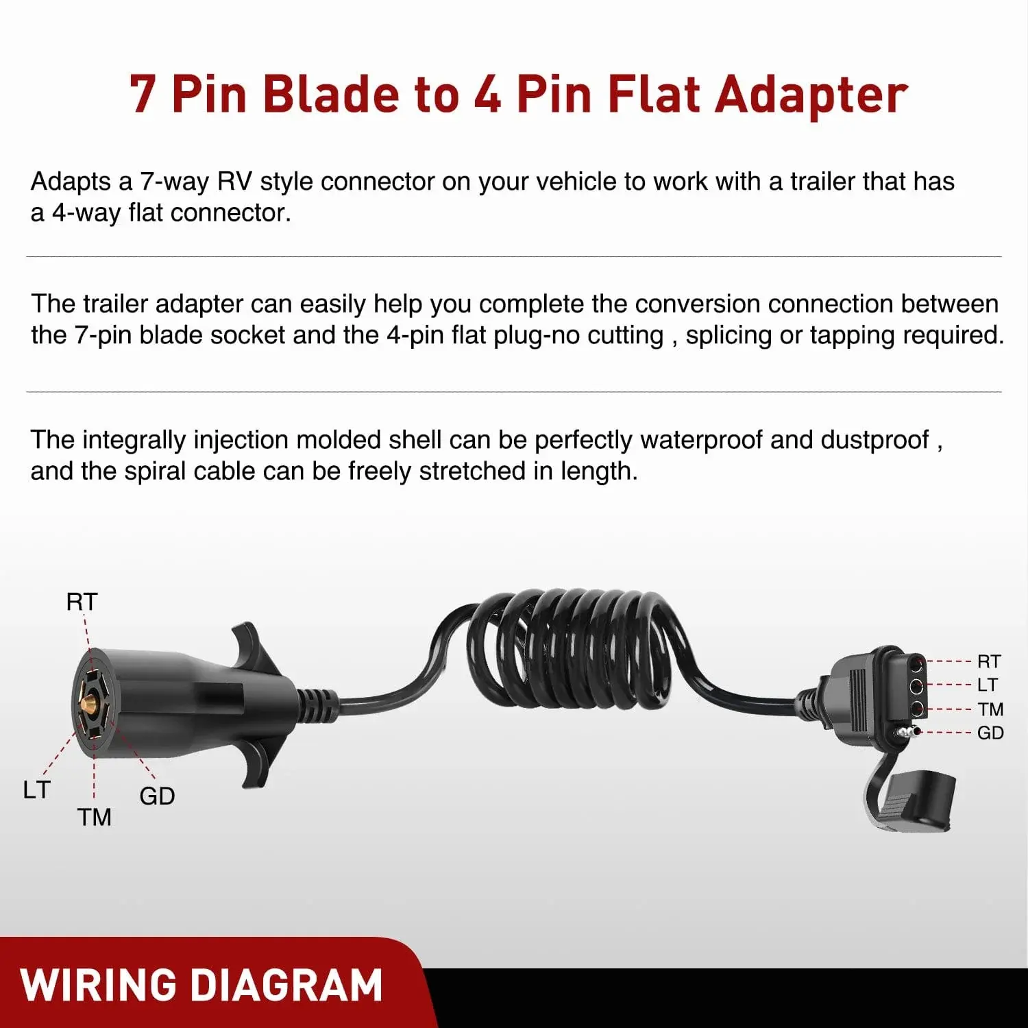 ·Package Include: 1 x 7 Way Blade to 4 Way Flat Coiled Trailer Wiring Harness 5Ft, 1 x User Manual. Perfect for most trailers, semitrailers, caravans, RV. Commonly used with tail lamp converters with 4-way flat trailer end connections.