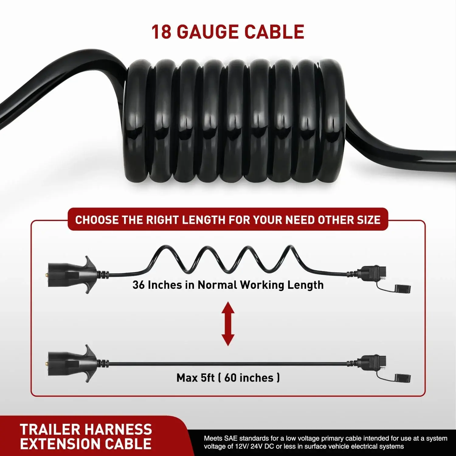 ·Durable Construction: Heavy duty black plastic construction prevents rusting. Stretchable 18-gauge 7 way round to 4 way flat flexible coiled cable with 5ft full extension makes the wire does not drag but yet allows for the extra length needed for tight turns with a trailer. Soft PVC protects the harness for long lasting use. A rubber dust cover equips with 4-pin connector to protect your terminal from dust and water.