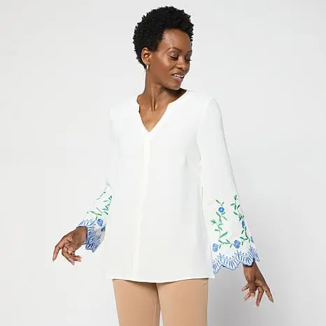 Nina Leonard Textured Wave Knit Embroidered Bell-Sleeve Top This top features a split neck and textured wave fabric with embroidered bell sleeves that add a touch of elegance to your look. Perfect for dressing up or down, it pairs beautifully with your favorite jeans or tailored pants. Enjoy the comfort and style that make this a versatile addition to your wardrobe.