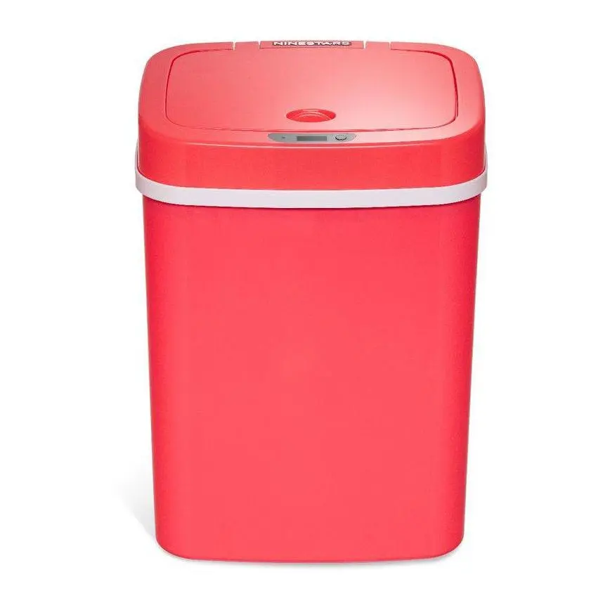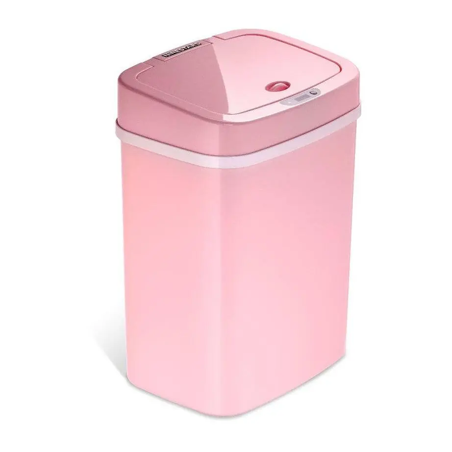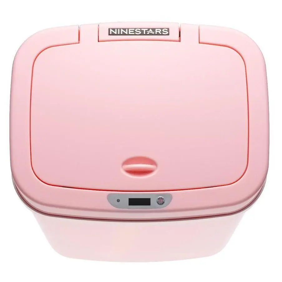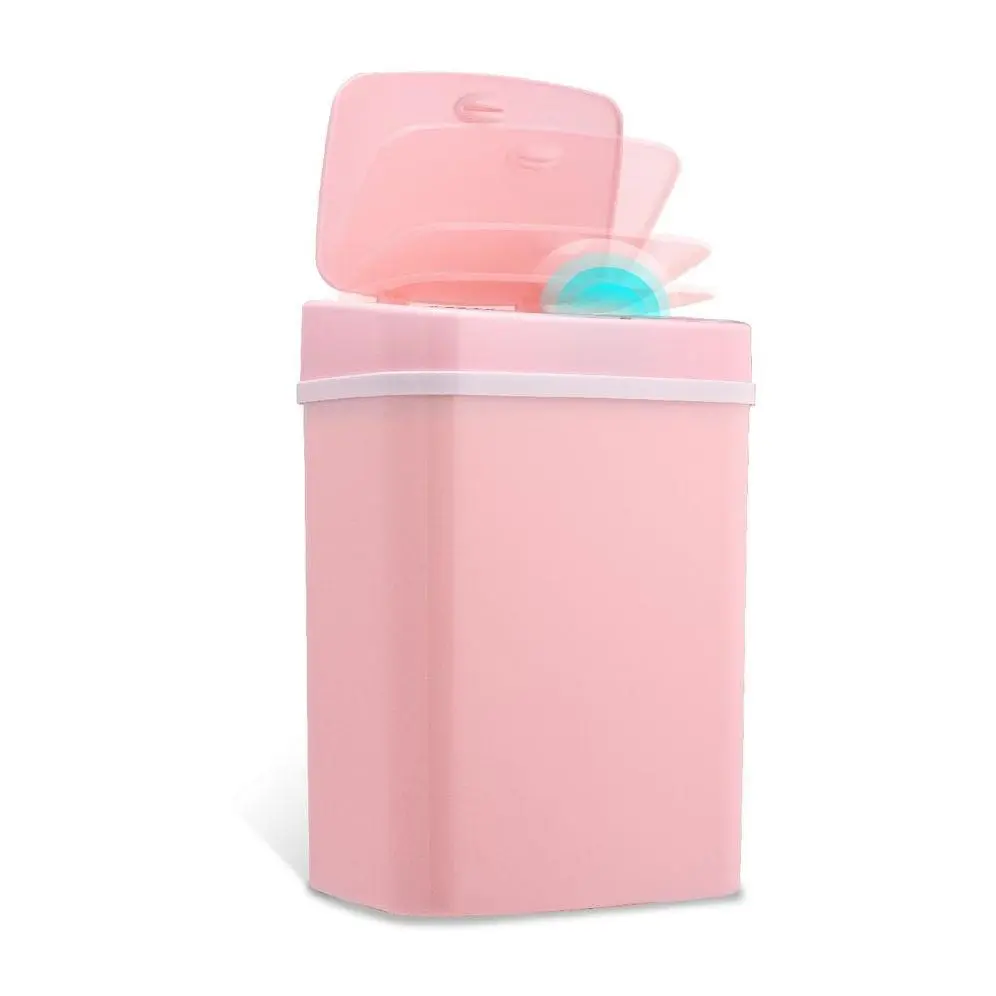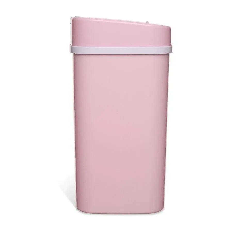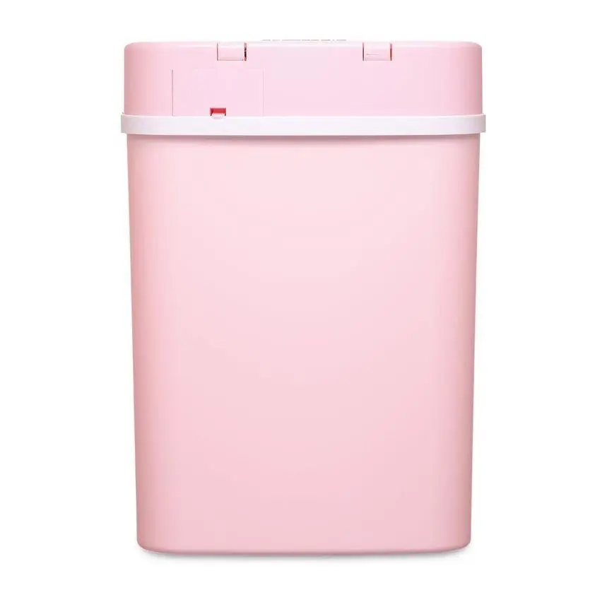 Absolutely the cutest little pink trash can. The lid takes 2 AA batteries and closes on its own.